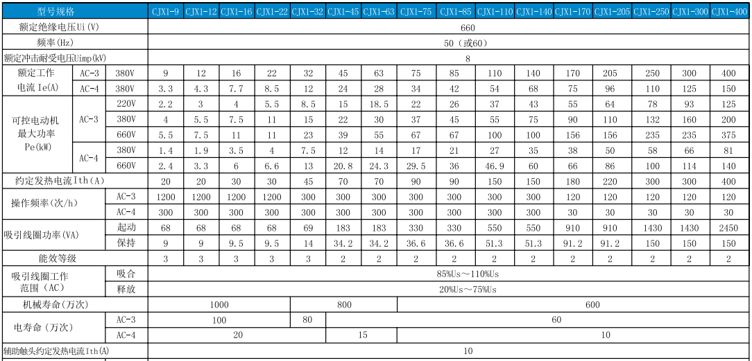 CJX1系列交流接触器(以下简称接触器)主要用于交流50Hz(或60Hz),额定绝缘电压为660V,在AC-3使用类别下额定工作电压为380V时额定工作电流为09~400A的电力线路中。作为供远距离接通和分断电路之用,并适用于控制交流电动机的起动、停止及反转。